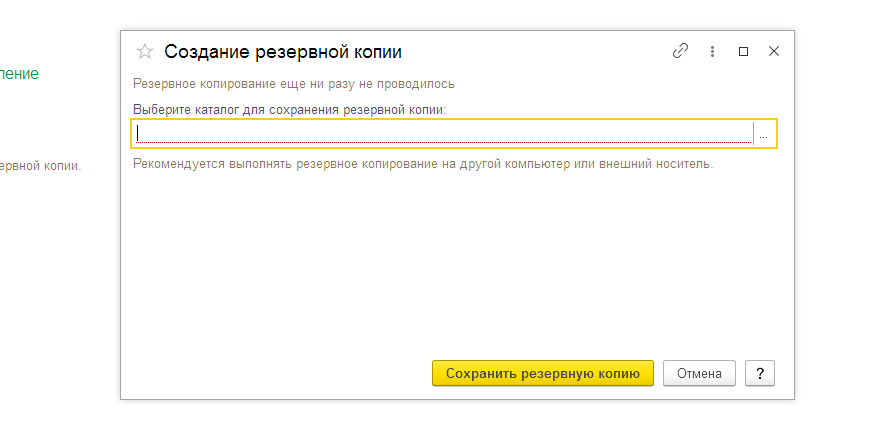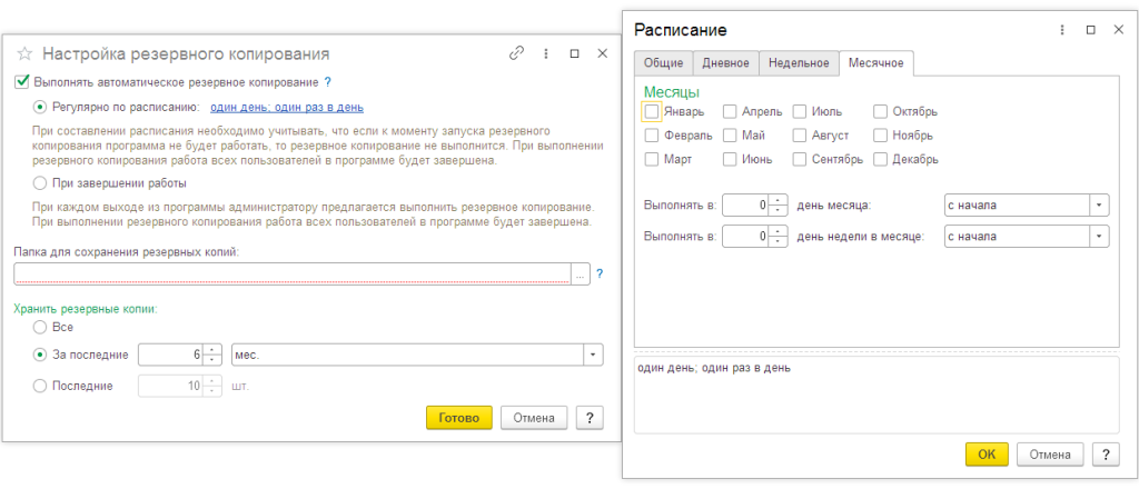 • В поле "Каталог для сохранения резервных копий" укажите путь к папке, в которую будут помещаться резервные копии информационной базы. Могут быть выбраны: текущее рабочее место, другой компьютер, внешний носитель.