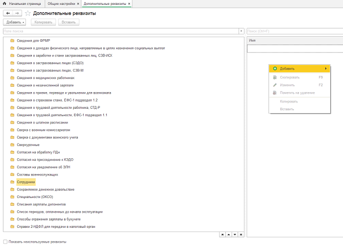 Сначала откроем папку «Сотрудники» в левом столбце и кликнем на неё. Затем, щелкнув правой кнопкой мыши на правом столбце, добавим новый реквизит.