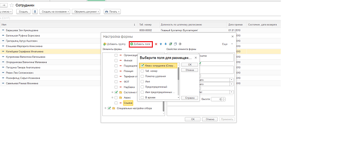 Далее изменим форму списка «Сотрудники», добавив в неё ссылку на «Класс сотрудника».