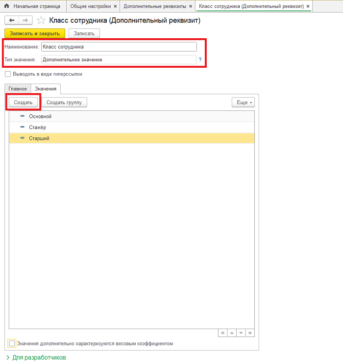 В открывшемся окне укажем название реквизита и выберем тип значения – «Дополнительное значение». После этого перейдем на вкладку «Значения» и создадим три класса: стажёр, основной и старший. Не забудем сохранить изменения.