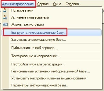 Далее выбираем пункт меню "Выгрузить информационную базу" в разделе Администрирование.
