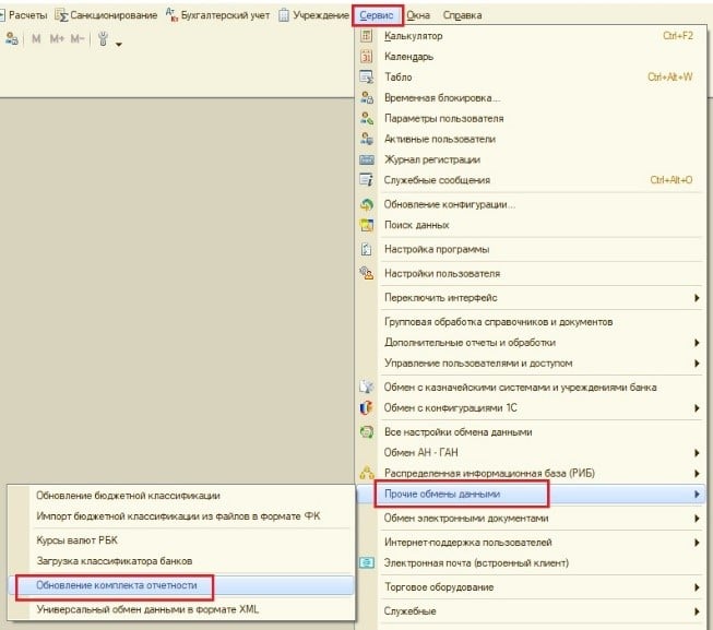В пункте меню Сервис выбираете команду Прочие обмены данными – Обновление комплекта отчетности