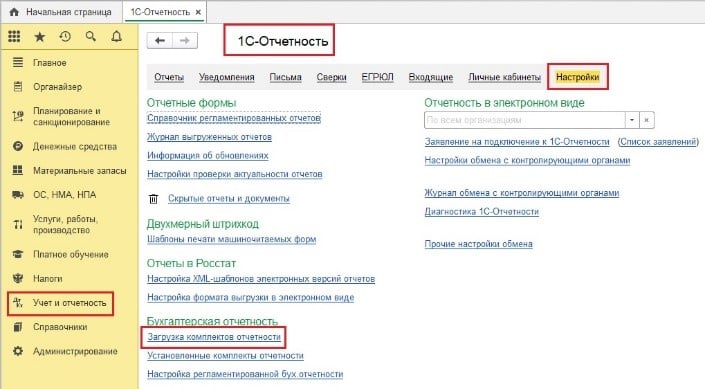 Учет и отчетность – 1С-Отчетность – Настройки – Загрузка комплектов отчетности
