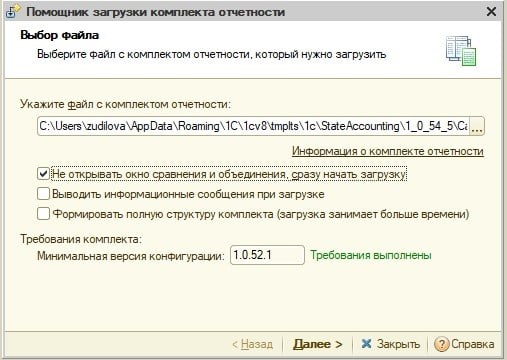 Далее указываете файл комплекта отчетности и нажимаете кнопку Далее и Готово. (Для ускорения процесса обновления можно установить флажок в поле Не открывать окно сравнения и объединения, сразу начать загрузку).