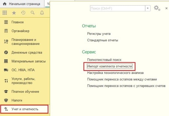 Учет и отчетность – Сервис – Импорт комплекта отчетности