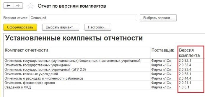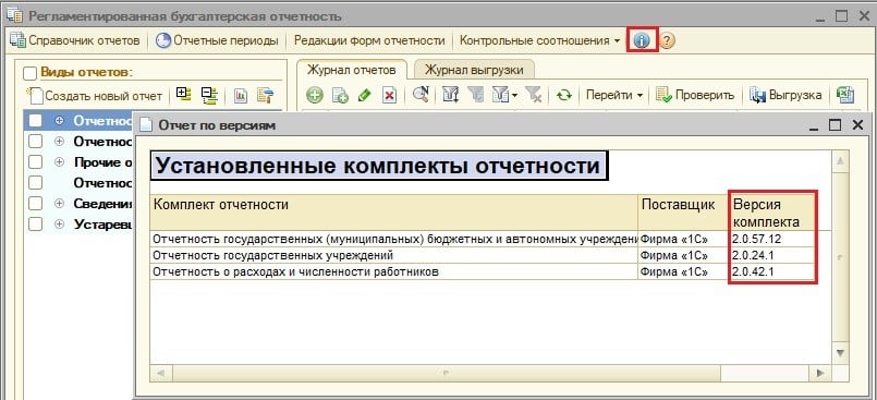 Учет и отчетность – 1С-Отчетность – Настройки – Установленные комплекты отчетности. Установленный комплект отчетности следует смотреть в графе Версия комплекта.