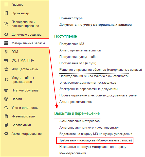 1.1. Списание материалов на изготовление комплектов белья оформляется документом «Требования-накладные (Материальные запасы)» из меню «Материальные запасы» - «Выбытие и перемещение» (рисунок 1).