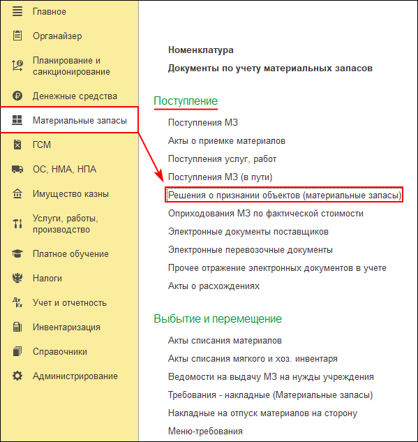 3.6. Признание объектов нефинансовых активов в связи с созданием хозяйственным способом оформляется «Решением о признании объектов нефинансовых активов (ф. 0510441)». Эта форма применяется всеми учреждениями с 01.01.2023 г. Для того чтобы проголосовать комиссии по поступлению и выбытию активов и распечатать данный документ, необходимо его создать. Он находится в меню «Материальные запасы (Поступление)» (рисунок 12).