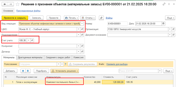 Для выдачи нефинансовых активов для использования в деятельности учреждения применяется требование-накладная (ф. 0510451). Эта форма обязательна к применению всеми учреждениями с 01.01.2024. Признание объектов нефинансовых активов в связи с созданием хозяйственным способом оформляется «Решением о признании объектов нефинансовых активов (ф. 0510441)». Эта форма применяется всеми учреждениями с 01.01.2023 г. Согласно методическим указаниям (приложение 5 к Приказу № 61н) решение (ф. 0510441) оформляется для принятия к учету материальных запасов, в отношении которых устанавливается срок эксплуатации. При этом для запасов, в отношении которых срок эксплуатации не устанавливается, оформление решения (ф. 0510441) не предусмотрено. Однако есть указание на формирование этого документа при завершении вложений в объект нефинансовых активов. Поскольку при изготовлении материалов для нужд учреждения собственными силами формируются вложения на счете 106.00, рекомендуем зафиксировать решением (ф. 0510441) факт окончания вложений.