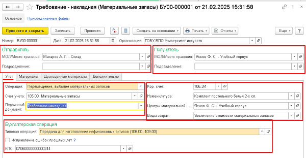 - в группе реквизите «Получатель» – ответственное лицо и подразделение, принимающие материалы.