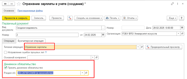 2.3. На закладке «Бухгалтерская операция» (рисунок 7) реквизит «Типовая операция» имеет единственное значение «Отражение зарплаты». «Основной контрагент» – для этого примера можно не заполнять. Реквизиты группы «Денежное обязательство» заполняются при необходимости сформировать проводку по принятию денежного обязательства.