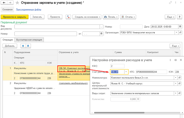 - «Операция» – выбирается из выпадающего списка справочника Виды операций отражения зарплаты в учете;