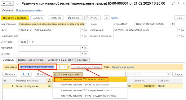 3.10. После записи документа (кнопка «Записать») на закладке «Материалы» становится доступной возможность зарегистрировать результаты голосования членов комиссии (рисунок 14). Для этого в группе «Голосование» в поле «Сотрудник» выбирается член комиссии, который по кнопке «Установить решение» и выборе «За» или «Против». принимает решение. Каждый член комиссии должен принять и зафиксировать в программе решение по каждой строке документа. Чтобы установить решение "За" во всех строках для всех членов комиссии, следует воспользоваться кнопкой «Единогласное решение».