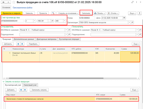 В бюджетном учреждении "ГОБУ ВПО Университет искусств " из приобретенной ранее ткани пошиты 40 комплектов постельного белья для нужд учреждения. Белье пошил сотрудник учреждения, с которым заключен договор гражданско-правового характера на выполнение работ.