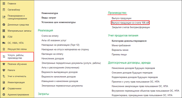 3.1. Для формирования бухгалтерских записей по оприходованию материалов, изготовленных для собственного потребления, можно использовать документ «Выпуск продукции со счета 106.хИ» раздела «Услуги, работы, производство» - «Производство» (рисунок 8).