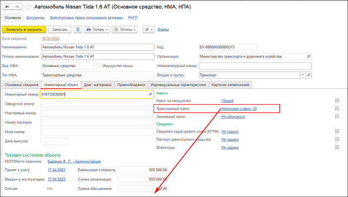Заполнить регистр сведений «Регистрация транспортных средств» можно также, открыв карточку для этого основного средства на закладке «Инвентарный объект», перейдя по гиперссылке «Транспортный налог» в разделе «Налоги» (рисунок 2). Переключатель «Вид записи» находится в положении «Регистрация».