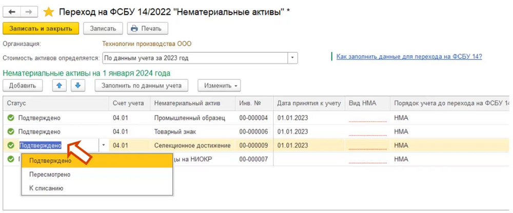 Статус по умолчанию устанавливается подтверждено. Если нам необходимо пересмотреть элементы амортизации либо списать актив, который больше не будет являться нематериальным активом, то можно изменить статус вручную.