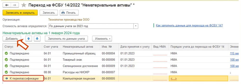 Если необходимо добавить актив, который ранее не учитывался в качестве нематериального актива, нажимаем кнопку «Добавить». Далее появляется новая строчка «К переклассификации», где указываем данные нематериального актива: счет, вид нематериального актива, элементы амортизации.