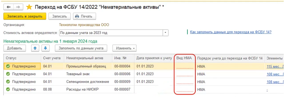При нажатии на данную операцию открывается документ перехода на ФСБУ 14. Изначально он пустой. Для заполнения нужно нажать кнопку «Заполнить по данным учета». После заполнения НМА по данным учета напротив каждого нематериального актива необходимо указать вид НМА по новому стандарту.