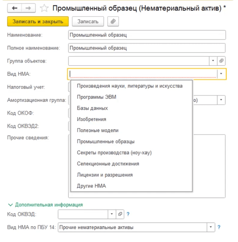 Данный вид будет сохранен в карточке нематериального актива. Также, помимо этого, в карточке сохраняется прежний вид НМА.