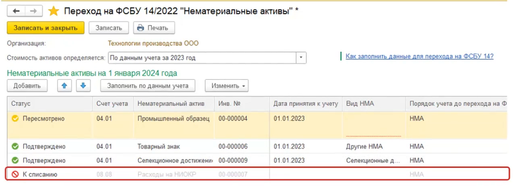 Если переход на ФСБУ 14 формирует бухгалтерские проводки, то для организаций на ОСНО появится операция «Корректировка отложенного налога по ПБУ 18», которую тоже нужно выполнить. Движение этих операций будут сделаны в межотчетном периоде. Сама обработка по заполнению данных по НМА на состояние закрытия месяца не влияет.