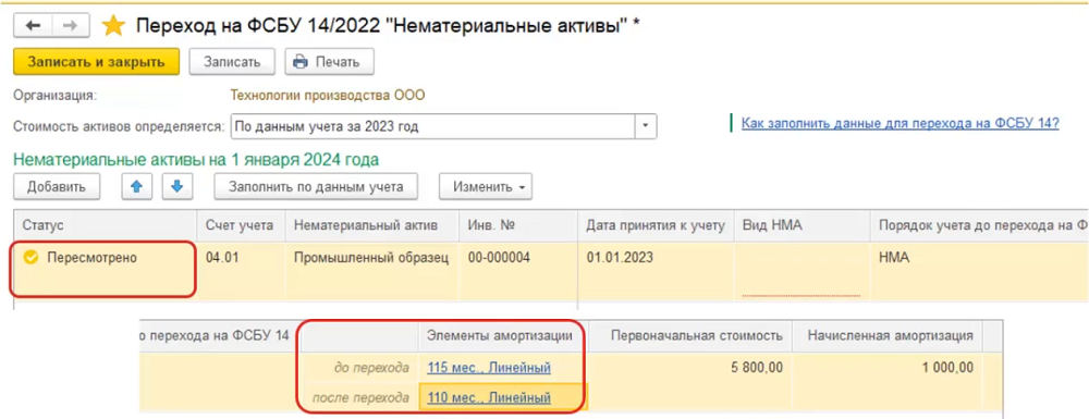 Например, нам нужно пересмотреть элемент амортизации. Для этого необходимо поменять статус НМА на «пересмотрено». Далее в табличной части появляется строка для указания новых элементов амортизации.