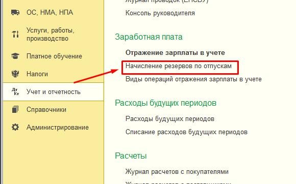 Резерв отпусков начисляется с помощью документа «Начисление резервов отпусков». Данный документ находится в разделе Учет и отчетность.