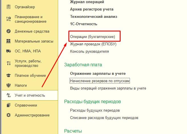 Для этого будем использовать документ Операция бухгалтерская. Он находится в разделе Учет и отчетность.