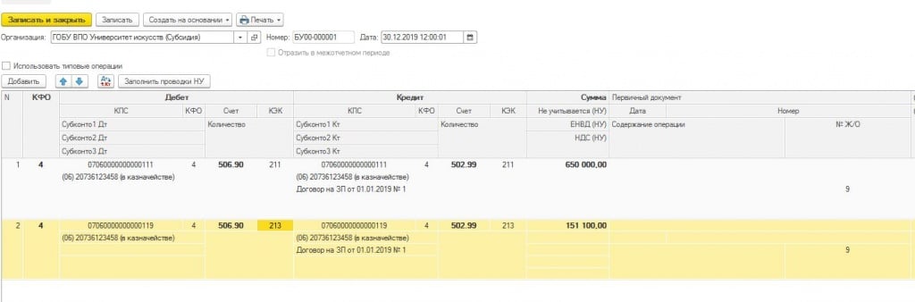 Далее проводим документ и можем просмотреть бухгалтерские записи: