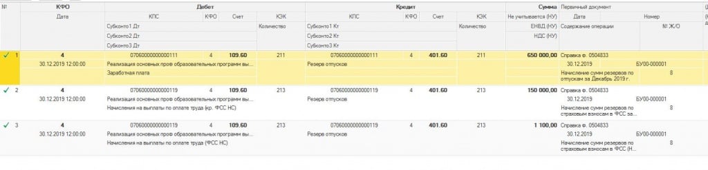 Вот такие проводки мы должны сформировать в конце года для отражения резерва отпусков на следующий год, а также отложенные обязательствам по отпускам.
