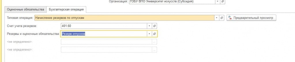 На 2 закладке Бухгалтерская операция заполняем, типовую операцию, счет учета резервов - 401.60 и резервы и оценочные обязательства.