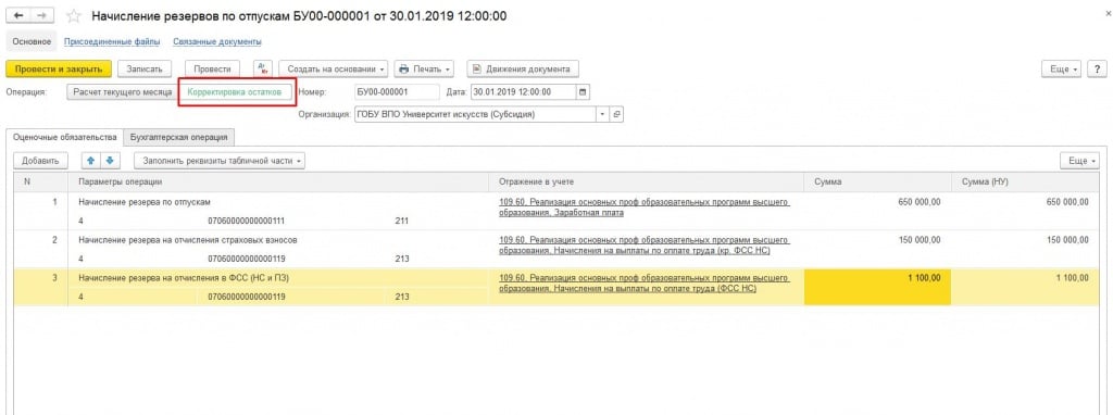 После заполнения и проведения документа необходимо принять отложенные обязательства по оплате отпусков.
