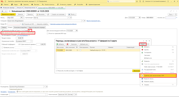 При включенном флажке выберем вкладку «Оплата» — «Зеленый карандаш «Изменить исключаемые периоды»». В открывшемся окне выберем «Еще» — «Сдвигать дату начала оплаты СФР». На закладке «Оплаты» добавлена надпись, информирующая о дате начала оплаты СФР.