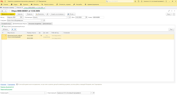 Допустим, сотрудник Базин А.В. находился в учебном отпуске с 15.02.2025 г. по 28.02.2025 г. В программе данный документ оформлен.