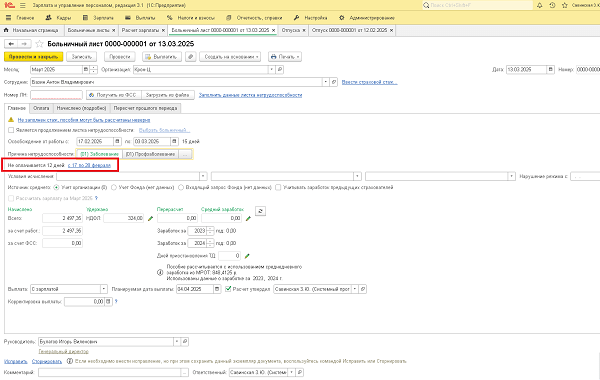 До недавних релизов в зарплатных программах 1С было реализовано следующее. Если на момент расчета больничного зарегистрирован учебный отпуск или отпуск без сохранения оплаты, то такие периоды исключались из расчета больничных только по отдельным причинам нетрудоспособности (карантин, уход за больным ребенком, уход за больным взрослым членом семьи). Теперь эти периоды отсутствия исключаются также из расчета больничных по причине заболевания или травмы, а также больничных по нетрудоспособности в связи с несчастным случаем на производстве и профессиональным заболеванием.