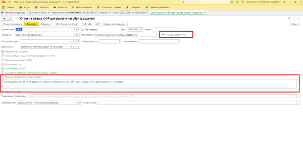 Изменения также касаются и автоматического заполнения «Ответа на запрос СФР». Период, за который назначается пособие с 01.03.2025 по 03.03.2025, полностью состоит из дней, которые оплачивает работодатель. При вводе документа ответ на запрос будет автоматически устанавливать флажок «Пособие не требуется». Также будет заполнена причина отказа от выплаты пособия с описанием периодов исключения и оплаты за счет работодателя.