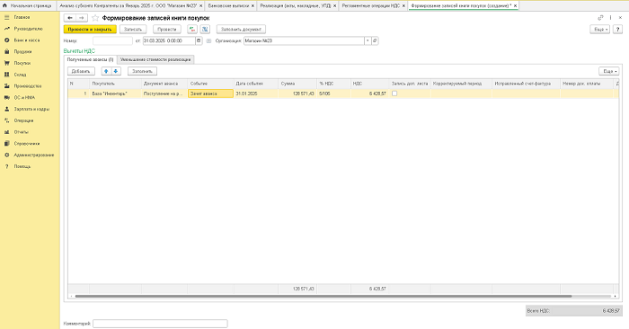 В регламентной операции «Формирование записей книги покупок» при заполнении отразится возврат аванса: