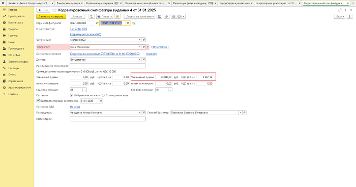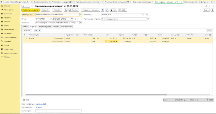 3. Изменение цены. В таком случае вносится документ «Корректировка реализации», а также корректировочный счет-фактура: