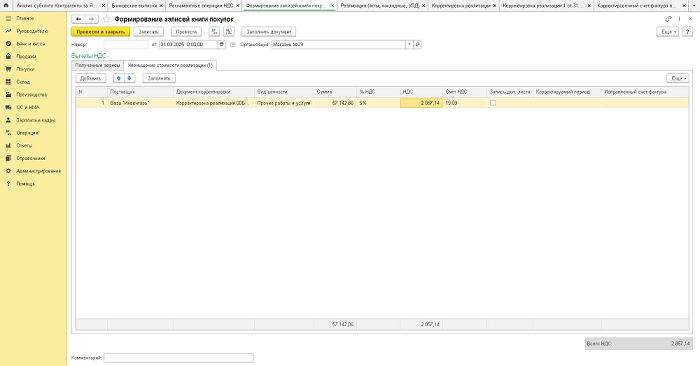 В регламентной операции «Формирование записей книги покупок» при заполнении отразится уменьшение стоимости реализации.