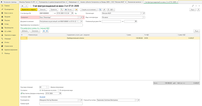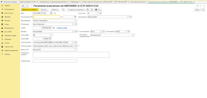 1. Обнуление НДС с аванса. Организация на УСН применяет ставку НДС 5%. Покупатель перечисляет организации аванс. В программе проводится документ «Поступление на расчетный счет» и счет-фактура, выданный на аванс: