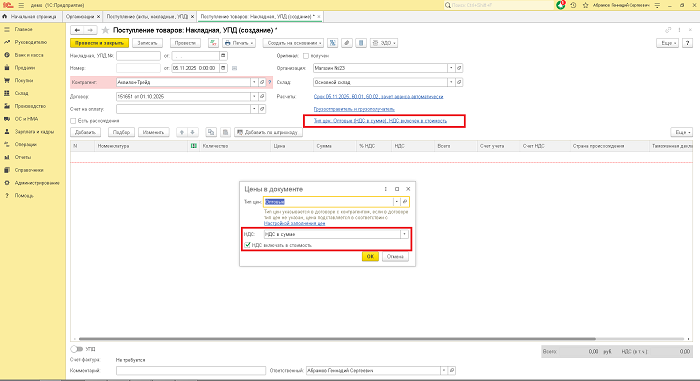 Поэтому правильнее будет, если галочка «НДС включен в стоимость» в документе «Поступление (акт, накладная)» будет проставлена.