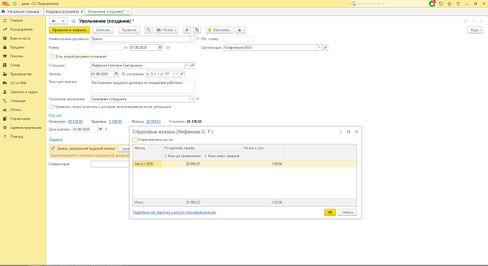 По гиперссылке «Удержания» можно также проверить корректность расчета НДФЛ и других удержаний при наличии. Данным документом будут начислены и страховые взносы.