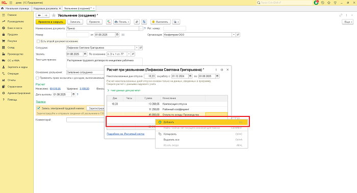 Если в документе требуется добавить дополнительное начисление, например, премию, перейдем по гиперссылке «Начислено». После этого в пустом блоке под начислениями нажать правой кнопкой мыши — «Добавить».