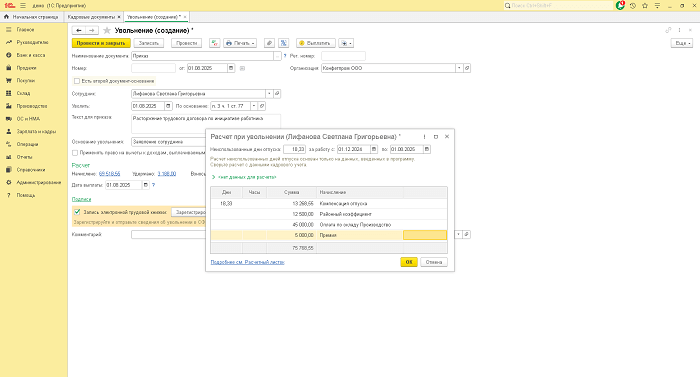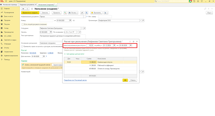 При переходе по гиперссылке «Начислено» можно проверить остаток отпуска, период, за который данный отпуск компенсируется, а также расчет среднего заработка и начисления. Поскольку в остальных кадровых документах продолжительность ежегодного оплачиваемого отпуска нигде не указывается, то по умолчанию продолжительность отпуска принимается за 28 дней. При необходимости, количество компенсируемых дней отпуска, как и другие начисления, можно скорректировать вручную.
