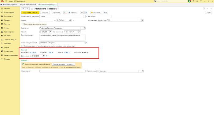 Начиная с релиза 3.0.176 в программе 1С:Бухгалтерия реализован расчет компенсации за неиспользованный отпуск при увольнении работника: в документе «Увольнение» добавили блок окончательного расчета при увольнении. Теперь при вводе кадрового документа «Увольнение» программа рассчитает количество дней компенсации, средний заработок и сумму компенсации, а также оплату по окладу за текущий месяц.
