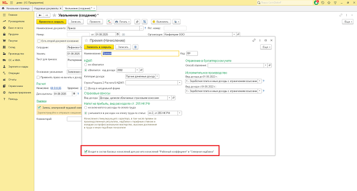 Если добавленное начисление входит в состав базы для расчета начислений «районный коэффициент» и «северная надбавка», то указанные надбавки пересчитаются автоматически после ввода суммы.