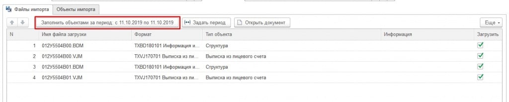 Нажимаем на кнопку «Заполнить объектами за период». Программа подберет необходимые данные из указанной папки и сформирует сведения в табличной части документа.