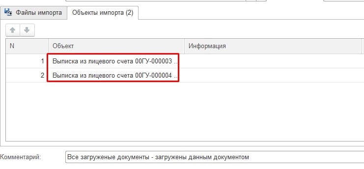 На вкладке «Объекты импорта» будут созданы документы Выписка. Их может быть несколько – по количеству лицевых счетов, по которым прошли операции.