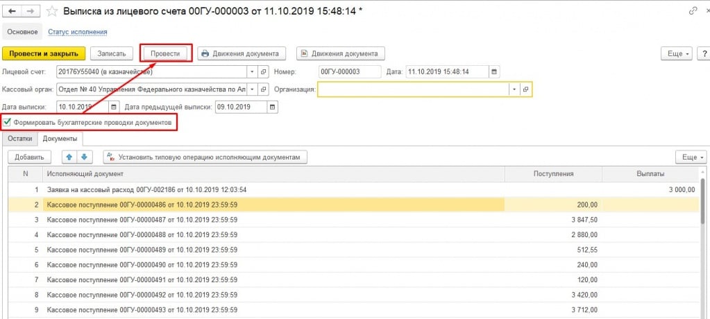 После удаления лишних позиций установите флажок «Формировать бухгалтерские проводки документов» и нажмите «Провести».