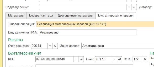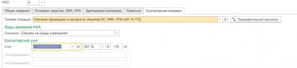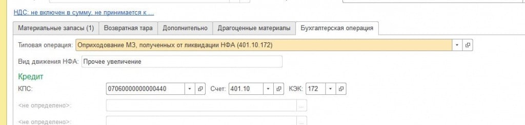 На закладке «Бухгалтерская операция» выберем операцию - Оприходование МЗ, полученных от ликвидации НФА (401.10.172).
